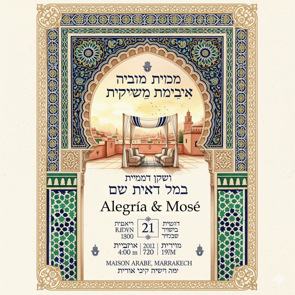 «DE PARTES DEL SEÑOR DON FULANO DE TAL, BOS PIDE DE FAVOR, QUE ESTE SABAT BALLAS AL SAFTERAY Y LA NOCHE DE ALHAD QUE BALLAS PARA LA ENBITA (tertulia), Y EL DOMINGO PARA EL ‘ARBID PRIMERO Y ROHEAR LA ACHUAR Y LEVARLA A CAZA DEL NOVIO, Y EL LUNES AL LABADO, EL CALDO DE LA NOVIA Y ALLEVAR ALA NOVIA AL MIKVE, Y EL MARTES A LA ALHENA, Y POR LA NOCHE A ROHEAR ALA NOVIA (*) A LLEVARLA A CAZA DEL NOVIO, EL MIERCOLES A LAS 4 DE LA TARDE AL SEBABERAJOT Y LA NOCHE ALA SE’UDA. DESPUES DEL SEBABERAJOT, LA SEUDA I SIGE LOS 7 DIAS DE FIESTA.»