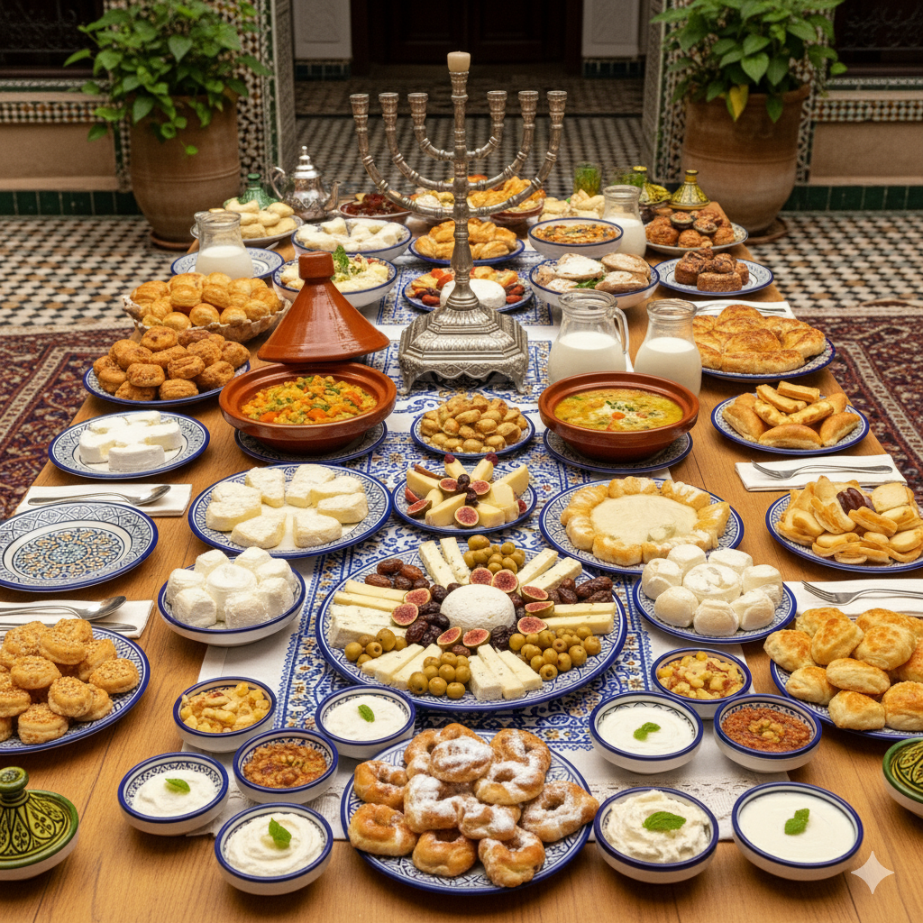 Lo tradicional en Shavuot en las comidas para conmemorar la festividad proviene del texto en el Shir Ashirim o “Cantar de los Cantares” del Rey Salomón que compara la Torá con la miel y la leche: “La dulzura de la Torá mana de tus labios como miel y leche yace bajo tu lengua”. La leche y los lácteos no era la comida habitual ni tradicional en países magrebíes donde los judíos no eran ganaderos y el ganado se componía generalmente de corderos y cabras. Con el peligro en la leche de cabra y sus derivados como el leven o el rayeb, que pocos la hervían suficientemente con el peligro de transmitir la terrible y larga enfermedad de la Fiebre de Malta que era endémica en el país. Y que también transmitía ese delicioso queso fresco, redondo, húmedo y muy blanco que se vendía en hojas verdes de palmito.